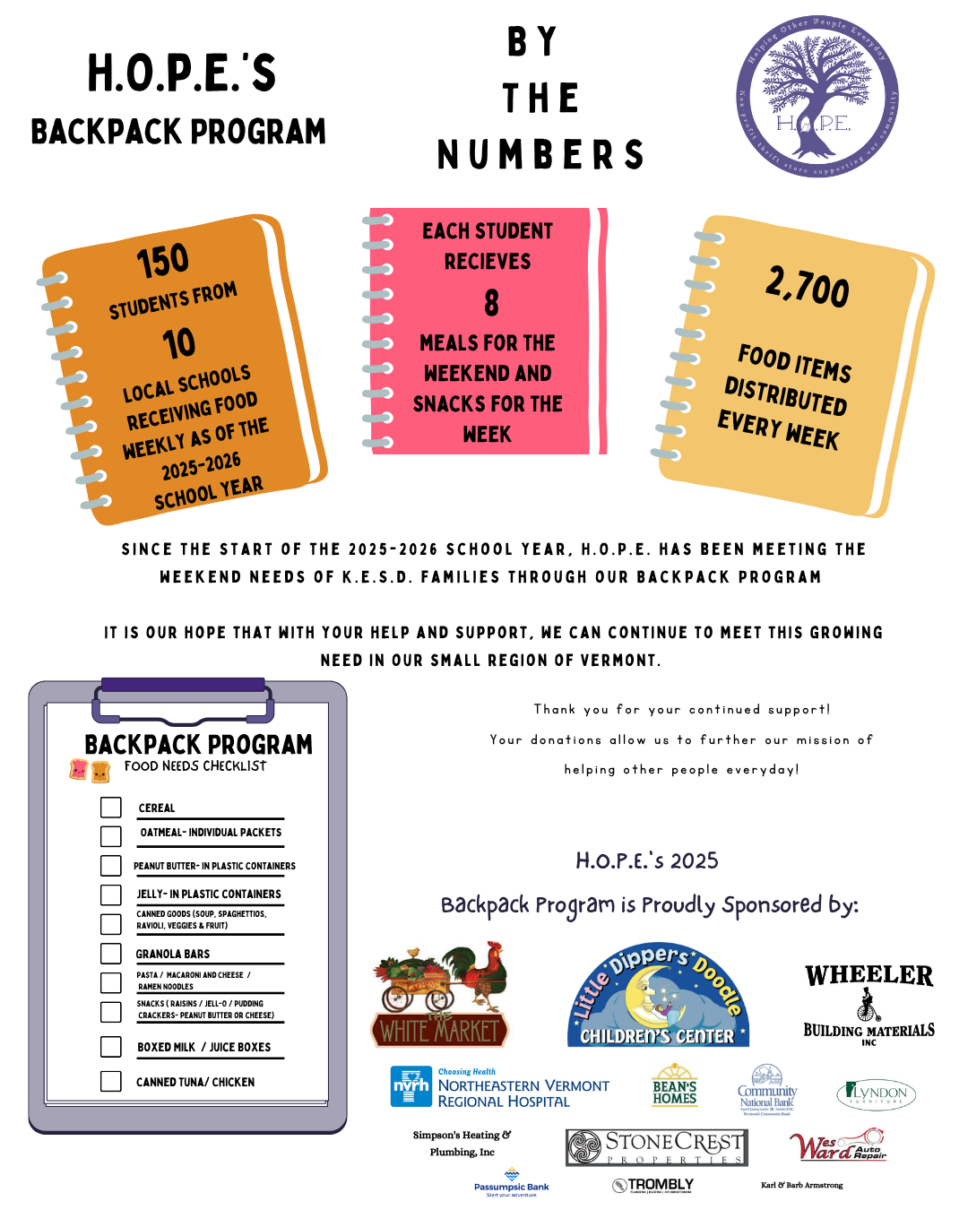 We are always accepting donations for the Backpack Program.Here is an example of what we typically put inside each backpack.